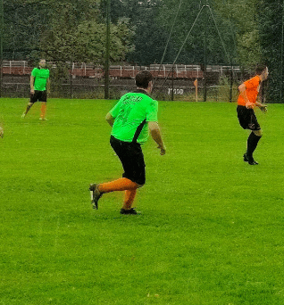 Le match : Les joueurs, jouant en vert pour l’occasion, commencent très fort avec des superbes débordements de Gatien 1 fois, 2 fois Et BIM, premier but au bout de 3 min. L’adversaire n’était pas encore bien réveillé, on a toujours le pied sur le ballon et Greg prend sa chance de loin, la pluie aidant, le gardien accompagne le ballon dans les cages 2-0 à la 20ème minute.