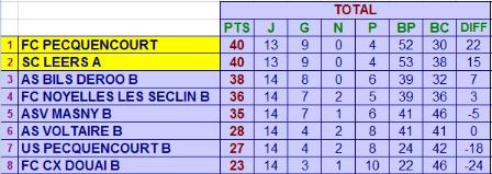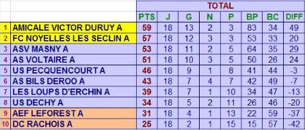 Le groupe dirigĂ© par Coach Maxime a connu une nouvelle saison mitigĂ©e (ou mi-figue mi-raisin pour les gourmands). MĂȘme si les premiers mois furent encourageants, l’euphorie est vite retombĂ©e Ă  partir de janvier. L’Ă©quipe s’est rarement prĂ©sentĂ©e avec 14 joueurs et la disparition de nombreuses recrues aura poussĂ© des joueurs blessĂ©s Ă  continuer de jouer malgrĂ© la douleur. Par chance, les Ă©quipes d’Erchin et Leforest ont enchainĂ© les dĂ©faites et elles ont finalement dĂ©clarĂ© forfait gĂ©nĂ©ral. Cela signifie que la B termine Ă  la 6Ăšme place (sur 8 au lieu de 10).